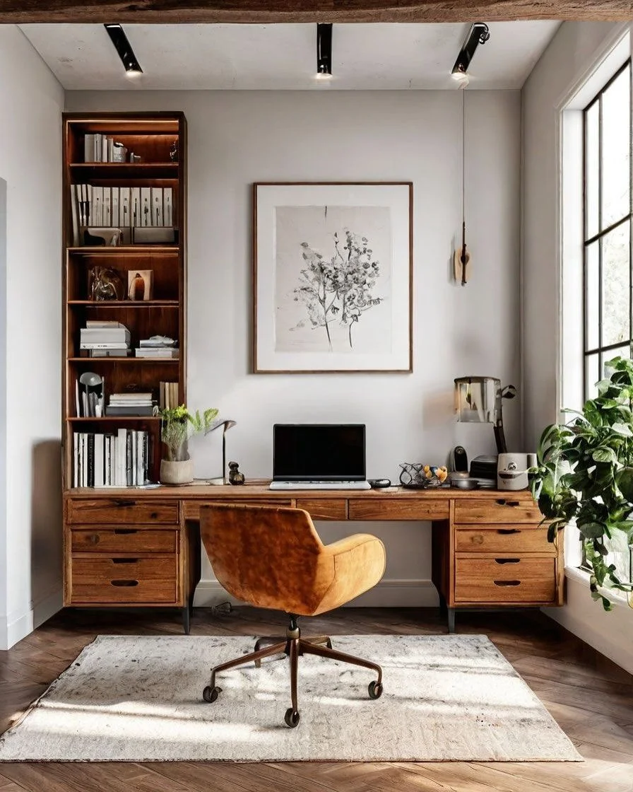 Если работаете с творческими задачами, добавьте в поле зрения акцент — зелёный, мягкий оранжевый или горчично-жёлтый. Необязательно красить стену: достаточно полки с книгами, постера, кресла или комнатного растения. Зелень живых растений работает особенно хорошо — это одновременно и цветовой акцент, и элемент биофильного дизайна.