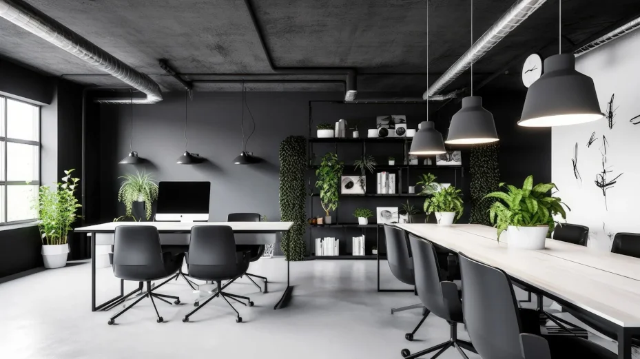 Можно ли красить офис в чёрный? Чёрный в небольших дозах — отличный инструмент: он структурирует пространство и выглядит современно. Но чёрные стены в рабочей зоне визуально уменьшают помещение и давят психологически. Используйте его на деталях: мебель, рамы, фурнитура.