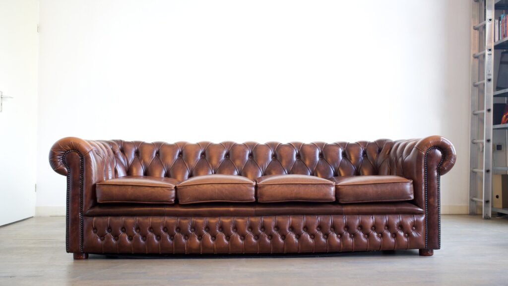 Самый простой способ понять, что перед вами диван Честерфилд – посмотреть на его спинку. Если она стёганая, с пуговицами или заклепками, то можно даже не сомневаться. Боковины дивана, чаще всего выполненного из высококачественной кожи (хотя и бархат производителям мебели не чужд), продолжают спинку, составляя с ней единое целое и находясь на одной высоте, а края спинки как будто закручены на манер рогалика.