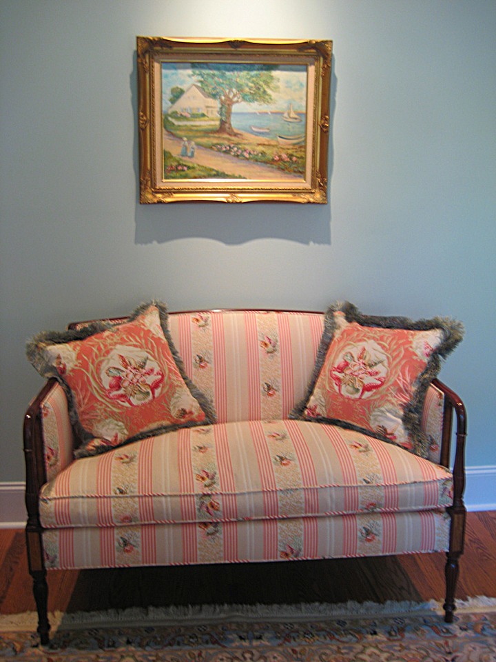 Изящные изогнутые ножки кабриоля, а также изогнутая дугой спинка, как будто отделяющая диван от всего остального интерьера и создающая несколько интимную атмосферу для сидящих, недвусмысленно намекают: лучшая обстановка для дивана — рококо, тут он будет чувствовать себя абсолютно гармонично. Эклектика, разумеется, тоже вполне подходит.